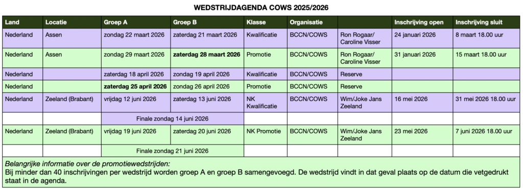 Belangrijke mededeling omtrent de Promotiewedstrijden: Bij minder dan 40 inschrijvingen per wedstrijd worden groep A en B samengevoegd. De wedstrijd vindt in dat geval plaats op de datum die vetgedrukt staat in de agenda.